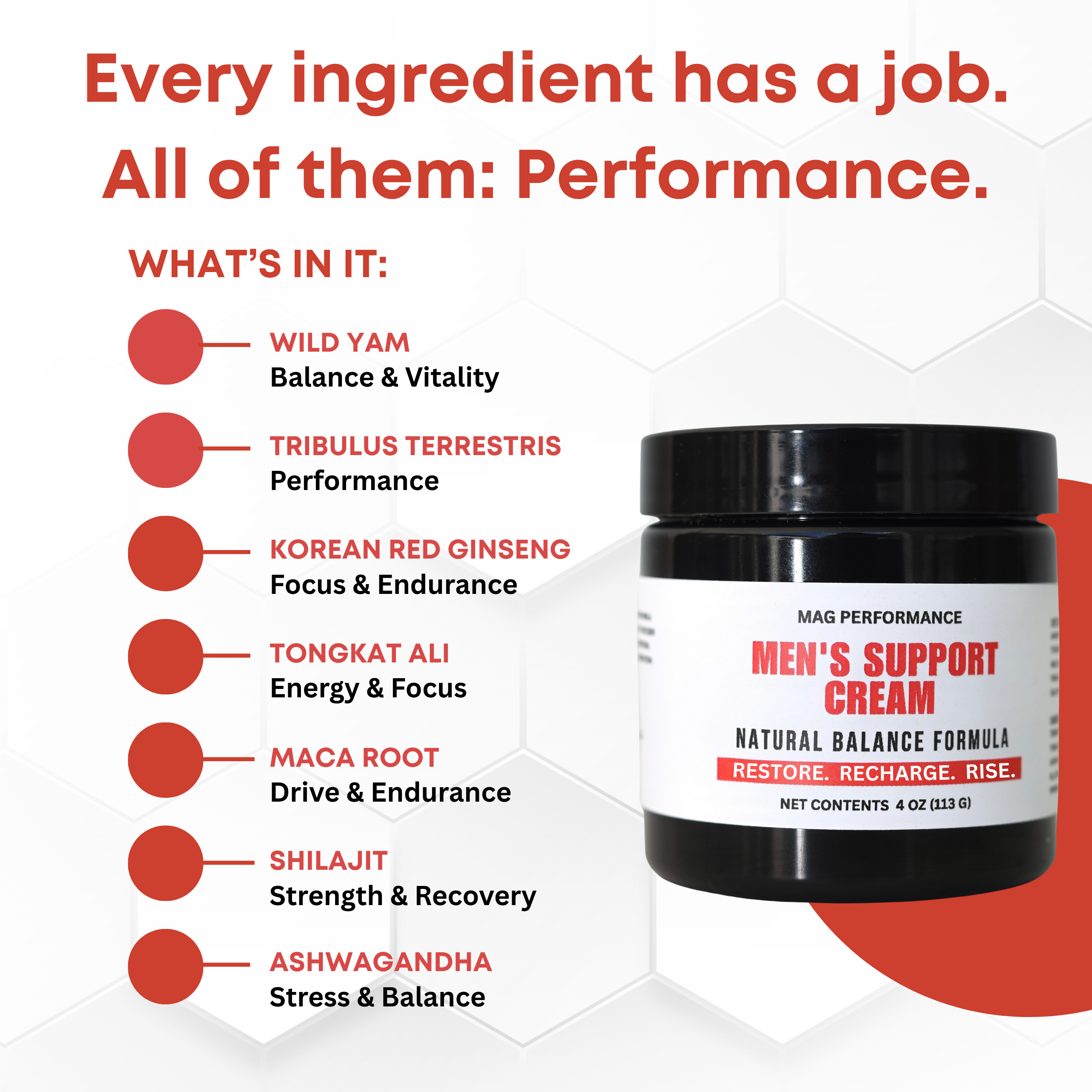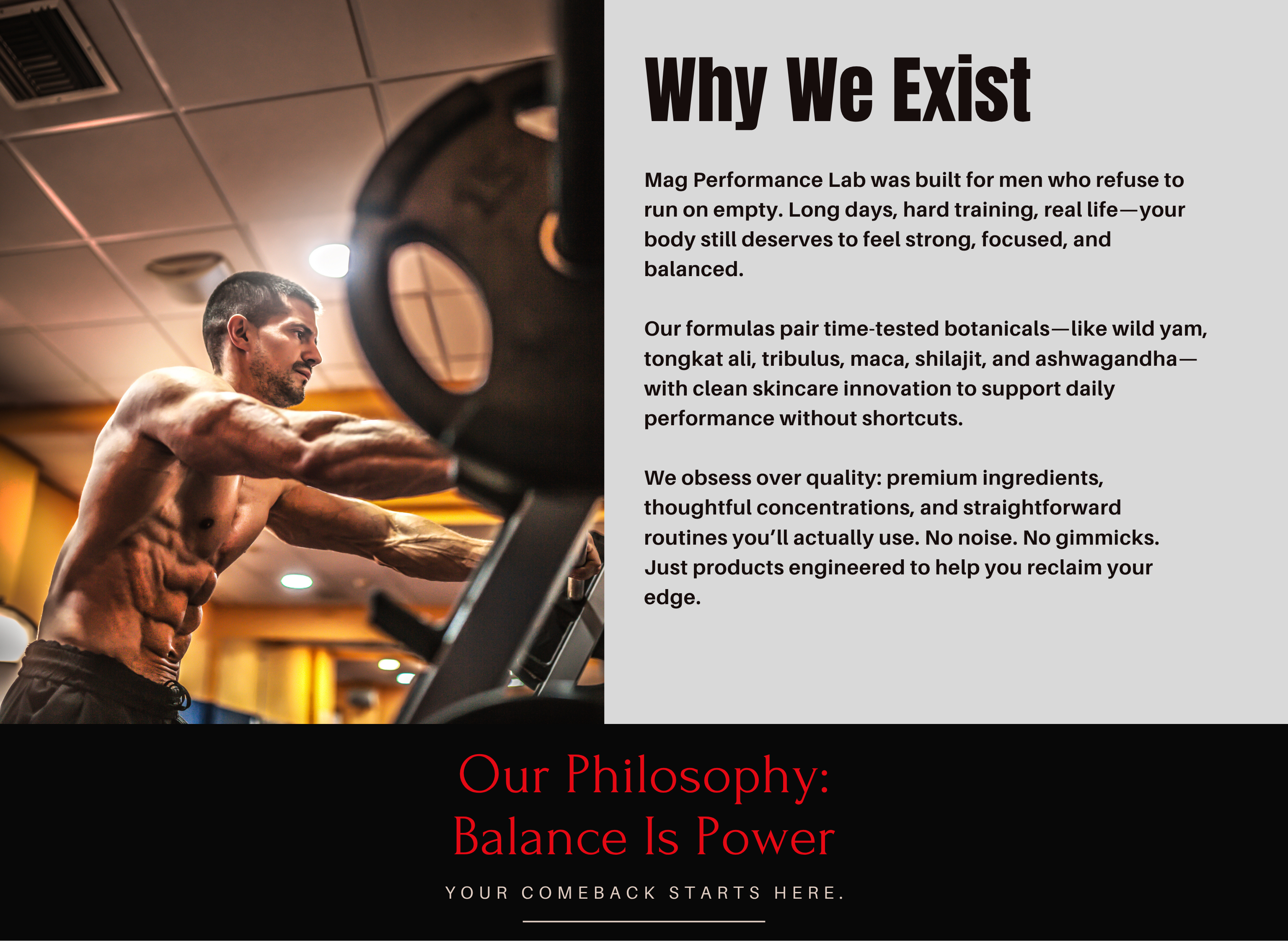We create clean, high-intent formulas designed to support strength stamina, focus, and balance - the fundamentals of everyday performance. Our flagship cream blends Wild Yam, Tongkat Ali, Tribulus, Maca, Shilajit, and Ashwagandha, bringing together time-honored botanicals with modern formulation standards.